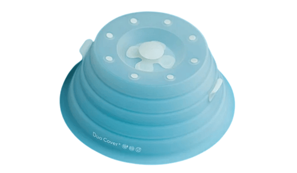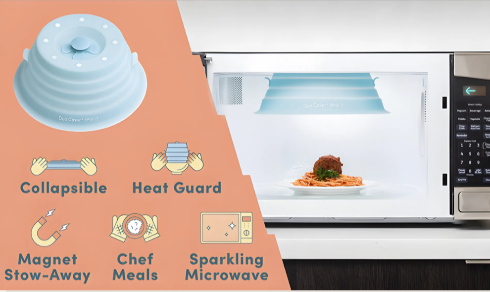 Duo Cover for Microwave is an innovative, collapsible splatter cover designed to solve the most common microwave problems—messy splatters, uneven heating, and dried-out food.