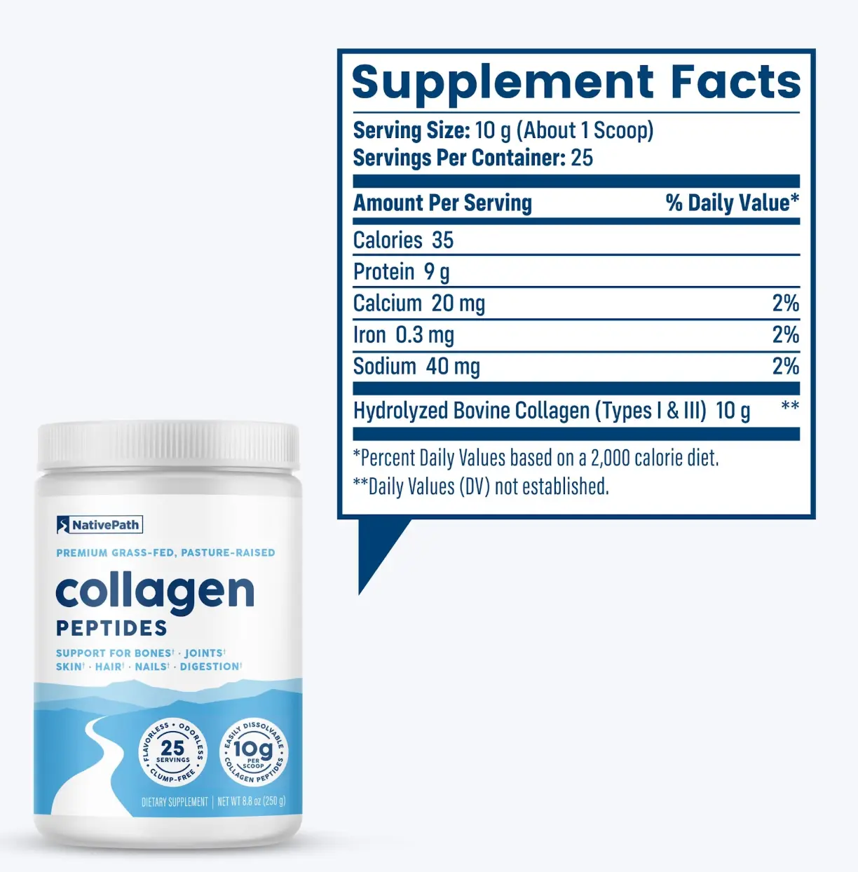 NativePath Collagen Peptides is a premium grass-fed collagen supplement designed to support healthy joints, stronger bones, youthful skin, thicker hair, and overall wellness.
