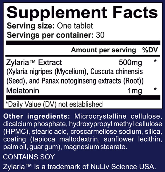 Zylaria™ is a proprietary blend containing Xylaria nigripes (Mycelium), Cuscuta chinensis (Seed), and Panax notoginseng (Root).