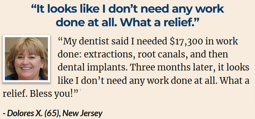 “My daughter got me this. I was skeptical. I didn’t think it would work because nothing else did. But it did work. It restored my decaying teeth, and my deteriorating recessed gums…and now, I do N-O-T need any dental surgery at all.”