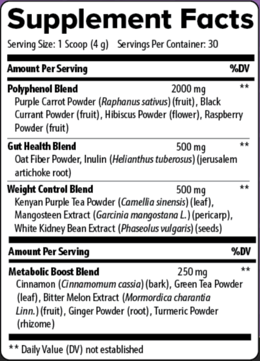 As part of the formula, purple carrot powder also supports metabolic function and can help regulate blood sugar levels, making it beneficial for overall health and weight management.