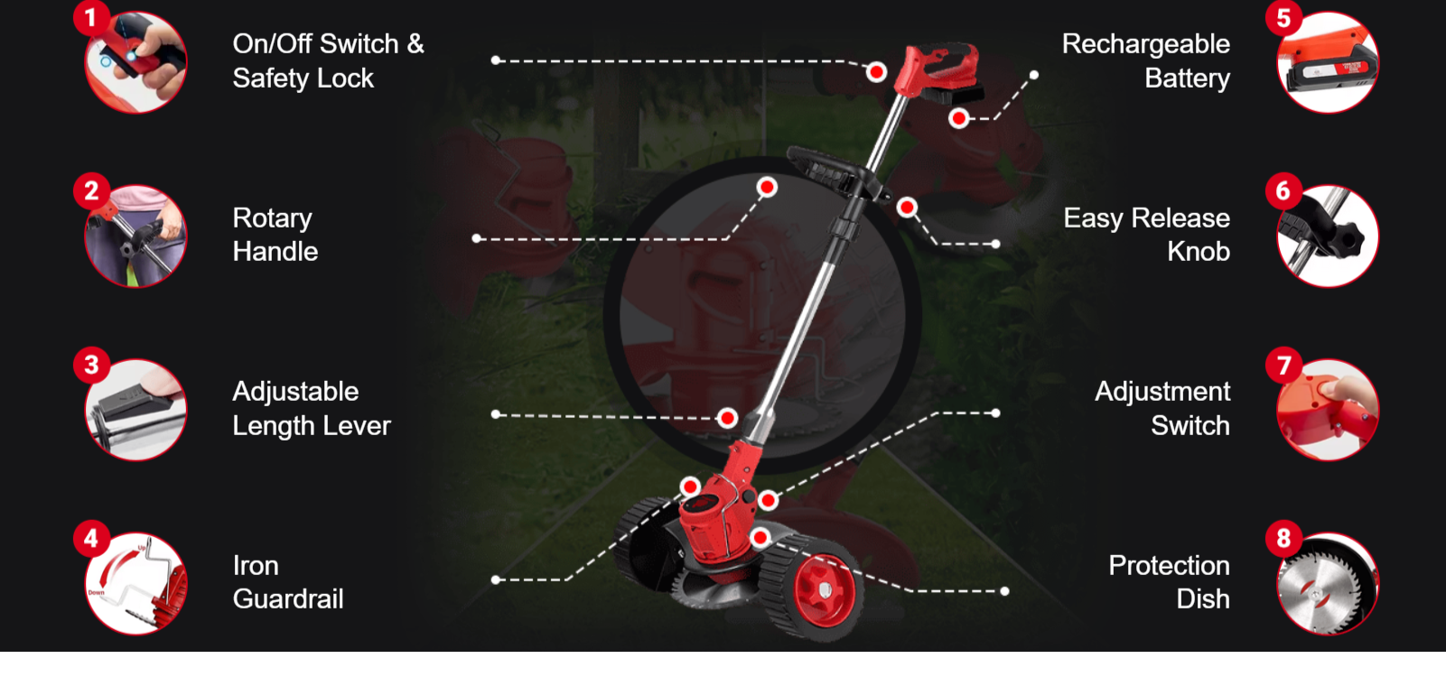 Precision Lawn Grooming: Maintaining a lush, even lawn becomes faster and more precise with this trimmer. It streamlines regular mowing, helping you achieve a perfectly groomed yard without exhausting effort.